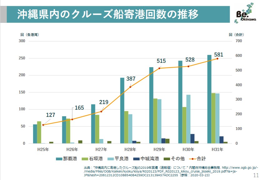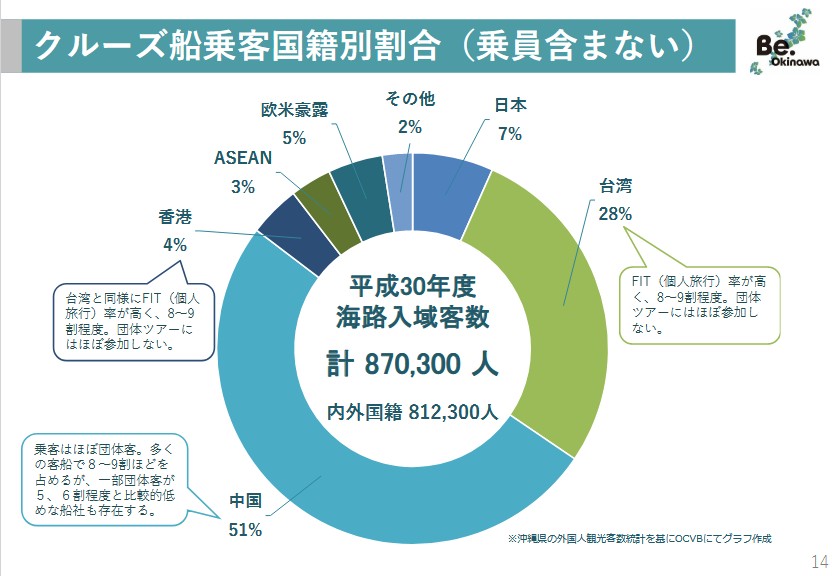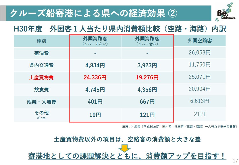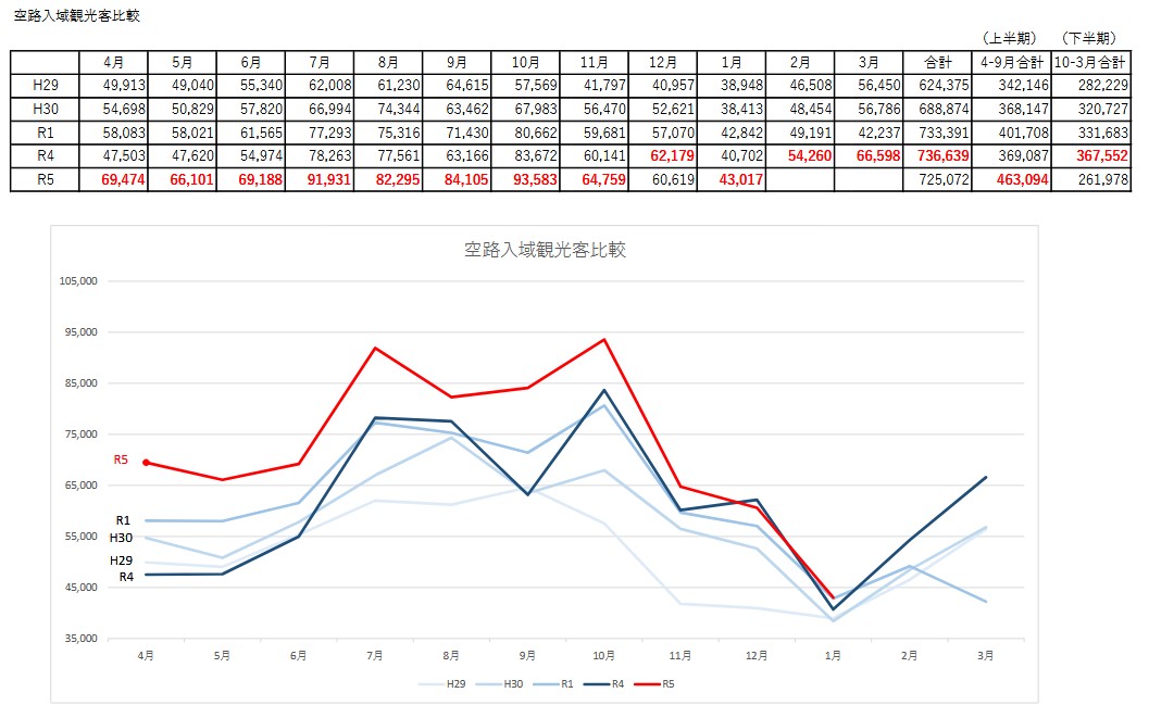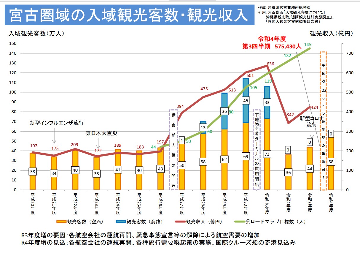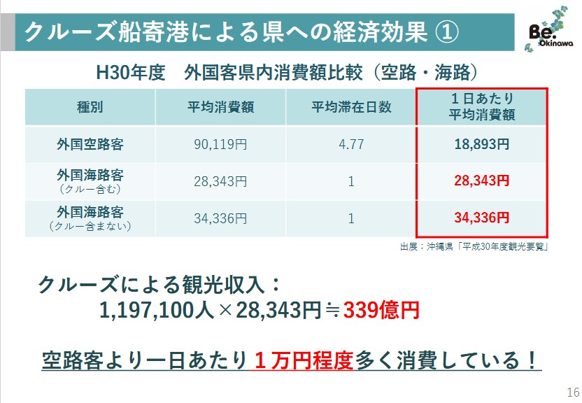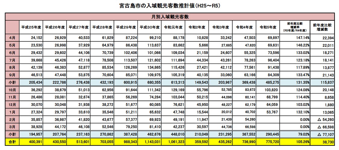 ![]() 過去最多を上回るのは確実か ようやくコロナ禍も収束し、2022年度の観光客数は73万人に回復し、2023年度は80万人を超すのは確実です(入域観光客数について>宮古島市の入域観光客数推計値(H25〜R5))。 ![]() 空路だけを見ると、すでにコロナ禍前を上回り、2023年度は80万人を超すのは確実です(入域観光客数について>空路入域観光客比較)。クルーズ船の寄港が本格化すれば、過去最多の2018年度を上回るのは確実と思われます。 ![]() 石垣市でも確実に回復 石垣市の観光客数は、2019年に過去最多の147万人を記録したものの、2020年には激減しています( 入域観光客数>石垣市の観光客数の推計&人口推計)。 ![]() 石垣市でも、空路の観光客数は確実に回復し、2023年は110万人目前で、過去最多の2019年に迫る勢いです( 入域観光客数>令和6年石垣市入域観光推計表)。 ![]() クルーズ船の寄港回数は拮抗 過去最多の観光客数を比べると、石垣市の方が宮古島市より30万人以上多いです。これは空路の観光客数の差によってもたらされたものです。 クルーズ船の寄港回数は、2013年では石垣港が県内最多でした。しかし、その後、那覇港の寄港数が急増し、ダントツとなりました。2014年には平良港の寄港数が急増し、石垣港と拮抗するようになっていました(令和2年度 地域別海外誘客プロモーション計画 クルーズ市場)。 ![]() 乗客は中国籍が半数、台湾籍が3割で、合わせて8割を占めています。中国発着の国際クルーズ船の再開動向が今後の寄港数の大きく影響しそうです。 ![]() 海路の外国人観光客は空路の外国人観光客よりも、1日あたりで1万円ほど多く消費しているということです。ただし、滞在日数は空路の外国人観光客の方が5倍ほど長いので、トータルでは空路の観光客は海路の観光客の3倍ほど消費していることになります。もっとも、国際クルーズ船は1日ごとに複数の都市をめぐるので、単純には比較できないという問題はあります。 ![]() また、海路の外国人観光客は、宿泊や朝・夕食は船内で済ませるので、土産買物費が消費の多くを占めています。そして、買い物は免税店や土産店が充実している那覇市内で済ませることが多いと思われるので、クルーズ船の寄港による宮古島市と石垣市への経済効果は限定的だと考えられます。 ![]() |