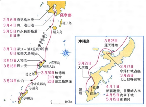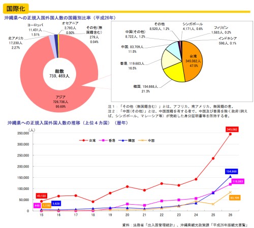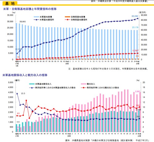 / 沖縄本島(沖縄島)の概要 琉球は王国の名称で、沖縄は島の名称です。琉球王国は琉球処分(1879年)により消滅し沖縄県となり、琉球王国の支配下にあった島々は、「沖縄の島々」となりました。琉球王国の王都のあった沖縄島(おきなわじま)は、現在では沖縄本島(おきなわほんとう)と呼ばれ、それ以外の島々は離島と呼ばれています。 なお、「都道府県庁の所在する本土から隔絶している島が離島」(離島(りとう)とは? 意味や使い方 - コトバンク)ということですが、この考え方によれば、石垣島や宮古島も離島ということになります。 沖縄本島は、大きく南北に分かれていて、北半分は山がちです(デジタル標高地形図「九州・沖縄」|国土地理院)。 ![]() さらに、南半分は中部と南部に分かれています。各地域の市町村は次のとおりです(沖縄本島でよく言われている「北部」「中部」「南部」ってどこのこと?)。 ![]() 北部は山がちなので、名護市にまとまった市街地がある程度です。 中部は、沖縄市(旧コザ市)・嘉手納町・北谷町に嘉手納基地があり、宜野湾市には普天間飛行場があります。 南部の那覇市、浦添市、豊見城市に人口が集中しています(沖縄県の市区町村)。 ![]() 人口分布図(沖縄本島および周辺離島の人口分布(2000年))を見ると、南部と中部に人口が集中しているのが分かります。中南部地域は、115万人を超える人口が集中し、政令指定都市に匹敵する都市圏を形成しています。一方、山間部と米軍基地がある辺りは人口がまばらです。 ![]() 日本史オンライン講座 大学講師と高校教師のコラボ日本史 研究者と学ぶ日本史41前半 琉球王国と中継貿易 研究者と学ぶ日本史41後半 琉球侵攻 三山時代(1322年ごろ〜1429年)の3王国の支配地域は、現在の北部、中部、南部とほぼ重なります( 琉球・南山王国をめぐる議論:三山は鼎立していたのか)。ただし、那覇市と浦添市は、中山王国の中心地域です。 ![]() 9箇所の世界遺産の7箇所は、かつての中山王国の領域にあります(沖縄の世界遺産)。 ![]() 沖縄戦(1945年4〜6月)では、宜野湾市、浦添市、那覇市が激戦地となりました(沖縄戦の戦闘経緯)。4月1日、中部西岸に上陸した米軍は、日本軍の守備の手薄な北部地域を3週間ほどで制圧します。一方、司令部(首里城)のあった中部地域では、日本軍は強固な防御陣地を築き、嘉数高台(宜野湾市)や前田高地(浦添市)の激戦では米軍にも多くの死傷者が出て、戦争に巻き込まれた多くの住民が命を落としました。5月末には日本軍は、南部へ向け首里を撤退します。南部地域は、避難民と敗残兵の入り乱れる修羅場と化し、多くの非戦闘員が命を落とします。6月23日、牛島司令官の自決によって守備軍の組織的戦闘は終了しました。 沖縄戦での死者は、沖縄の一般住民94,000人、軍人・軍属28,228人、本土の兵士65,908人、米兵12,520人ということです(沖縄県平和祈念資料館)。 ![]() 1609年の島津侵攻でも、主力部隊は大湾で上陸し南下しています(島津侵入事件(しまづしんにゅうじけん)とは? 意味や使い方 - コトバンク)。 ![]() 1972年の本土復帰後も、多くの米軍基地が残っています(沖縄県の米軍基地と普天間飛行場の移設案)。 基地の借地料は日本政府が払っていますが、多くの地主の借地料収入は年間200万円以下だそうです(軍用地主は大金持ちと聞きましたが本当ですか。 )なお、軍用地は近年、投資対象として人気が高まっているそうです(沖縄の軍用地は「カネのなる木」なのか ”普天間”の価格上昇が止まらない)。 ![]() 基地の借地料総額は年々増加しています。本土復帰直後は、米軍基地関係収入が県民所得の大きな割合を占めていました。しかし、復帰後は観光収入が急速に増加し、現在では米軍基地関係収入の約2倍に達しています(平成28年 沖縄県勢要覧 )。 ![]() アジアからの観光客が、外国人観光客の大半を占めています。特に近年、台湾からの観光客の増加が際立っています(平成28年 沖縄県勢要覧)。