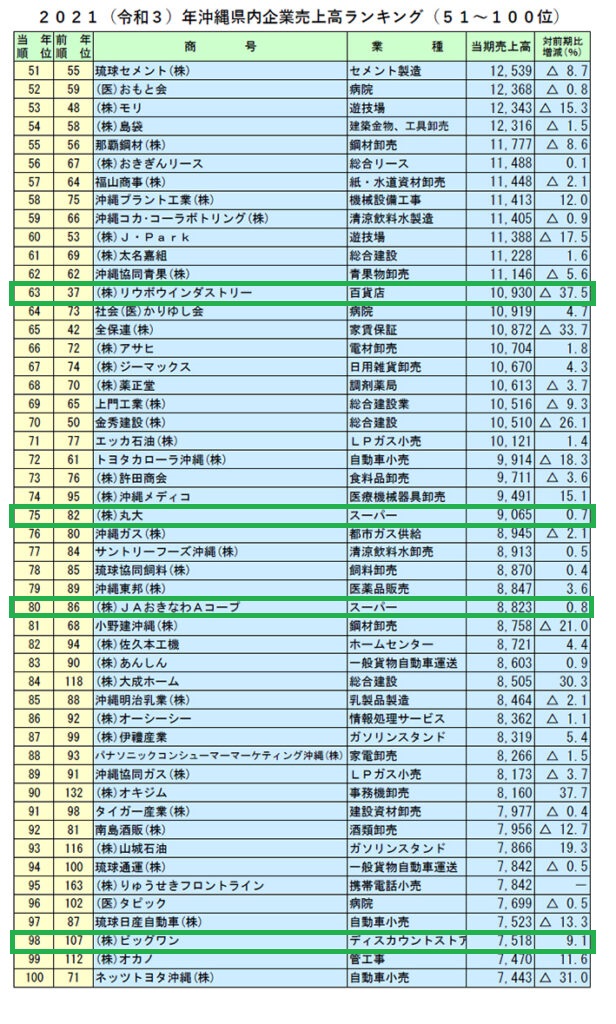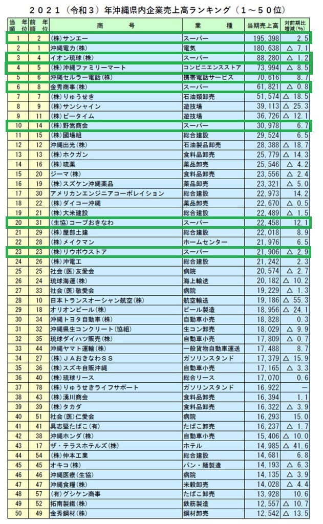 トップ10に小売業がずらり 沖縄県の企業の売上高ランキングは次のようになっています(サンエー4年ぶり首位 沖縄県の企業売上高ランキング | HUB沖縄(つながる沖縄ニュースネット))。グリーンで囲んだのが小売業です。10位以内に5社が並んでいます。 ![]() ![]() リウボウは、3つの事業が柱 リウボウグループは、コンビニ、スーパー、百貨店の3つの事業が柱になっています。コロナ前、百貨店は200億円に迫る売り上げがありました( リウボウグループ、増収減益 外国客売り上げ好調 決算)。 ![]() しかし、。コロナ禍の影響もあって、2022年2月期の売り上げは、101億円に落ち込んでいます(デパートリウボウ)。 沖縄にもコンビニのビッグ3が進出 コンビニは、沖縄にもビッグ3が進出しています(コンビニエンスストア(都道府県データランキング))。ファミリーマートが先行し、後発のセブンイレブンは最近急速に店舗を増やしています。