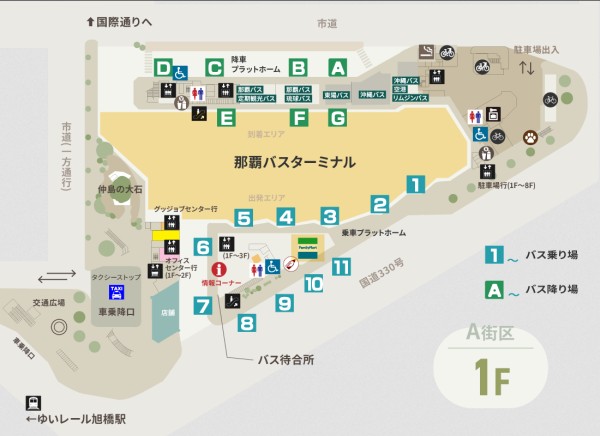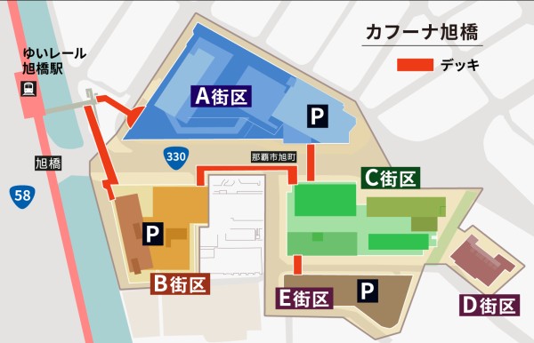 カフーナ旭橋は再開発によって誕生した都心エリアで、A街区からE街区まで5つの地区があります(施設情報|カフーナ旭橋)。A街区のビルは、1階が那覇バスターミナル、2階が那覇OPAのショッピングフロア、3階から11階までがオフィスフロアとなっています。B街区には、リーガロイヤルグラン沖縄とオフィスビル、C街区には、東急Reiホテルとオフィスビルがあります。D街区は分譲マンション、E街区は駐車場となっています。