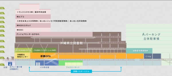 沖縄県立図書館は、カフーナ旭橋A街区にある11階建てビルの3〜6階にあります。3〜5階が閲覧フロアで6階は図書館事務所です。