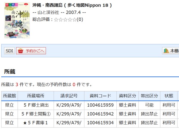 県立図書館のサイトの資料検索から、たとえば「沖縄・南西諸島 歩く地図Nippon 18」という本を検索すると、資料詳細が次のように表示されます。