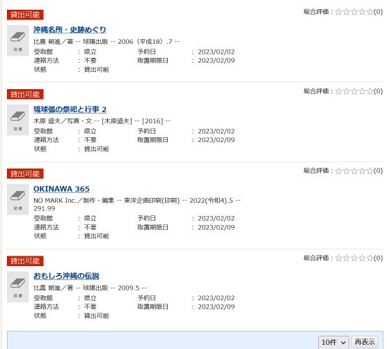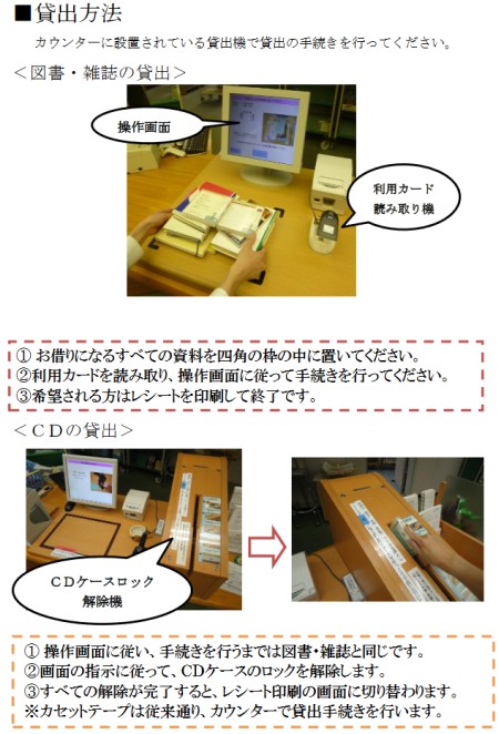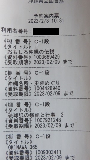 人口230万人の名古屋市の市立図書館は21館ですから、人口32万人の那覇市の8館というのは、十分多いといえます。ただし、名古屋市立図書館には、自動車図書館というものがあって、書架を積載した小型バスが、次のように市内100か所以上を巡回しています(自動車図書館ガイドマップ)。巡回は1か月半に1回程度ですが、予約した本の受け取りもできます。また、人口50万人の松山市の市立図書館は4館しかありませんが、移動図書館が165ヵ所のステーションポイントを2週間に一回、巡回していて、予約した本の受け取りもできます。那覇市立図書館でも、1976年から移動図書館を運営していましたが、2008年に終了しています(那覇市立図書館/館報2022)。 ![]() 沖縄県立図書館で予約した本を受け取るのは、完全セルフサービスとなっています。受け取り方法は次のようになっています(立川市立図書館/中央図書館利用の手引き)。沖縄県立図書館には、今のところ、受け取り方法の説明は掲示されていないし、ホームページにも掲載されていません。 ![]() 貸し出し手続きの詳細は次のようになっています。 ![]() 沖縄県立図書館では、まず、受け取りコーナー入口横の予約紹介機のバーコードリーダーに利用カードのバーコードをかざします。すると次のような内容が画面に表示されるので、画面の「印刷」アイコンをタップして、予約案内票を印字します。この機器は、本が取り置かれてある棚の番号を示すためだけのものです。 ![]() しかし、利用者は、図書館サイトの「Myライブラリー」で、次のように貸出可能となったことを、あらかじめ確認してから来館します。「Myライブラリー」に棚番号を表示しておけば、そもそも予約紹介機そのものが要らないのではないかという気もします。 ![]() 貸し出し手続きでは、複数の本を同時に処理できますが、それは次のような仕組みになっているからです。 貸し出しカウンターの四角の枠の下にはRFIDリーダライタが設置されていて、本に貼付されているICタグと無線で交信し、タグの情報を持出可に書き換えます。RFIDリーダライタは同時に複数のICタグと交信し、情報を書き換えることができるので、複数の本を同時に処理できます。入口のゲートにもRFIDリーダライタが設置されていて、ICタグの情報が持出不可となっていると警報が鳴るようになっています。 | ||
